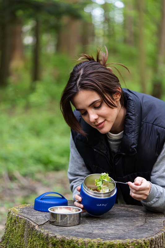 Produkt spełni swoje zadanie jako naczynie na gorące posiłki – doskonale sprawdzi się w przypadku zup czy kremów. Dodatkowo dużym atutem termosu jest pojemnik, który nadaje się idealnie do odseparowania dodatków do dania np. grzanek. Nad pojemnikiem jest tacka na sztućce, na której znajduje się składana łyżka. To rozwiązanie sprawia, że wszystko, co potrzebne do posiłku w plenerze czy w pracy, masz zawsze pod ręką.