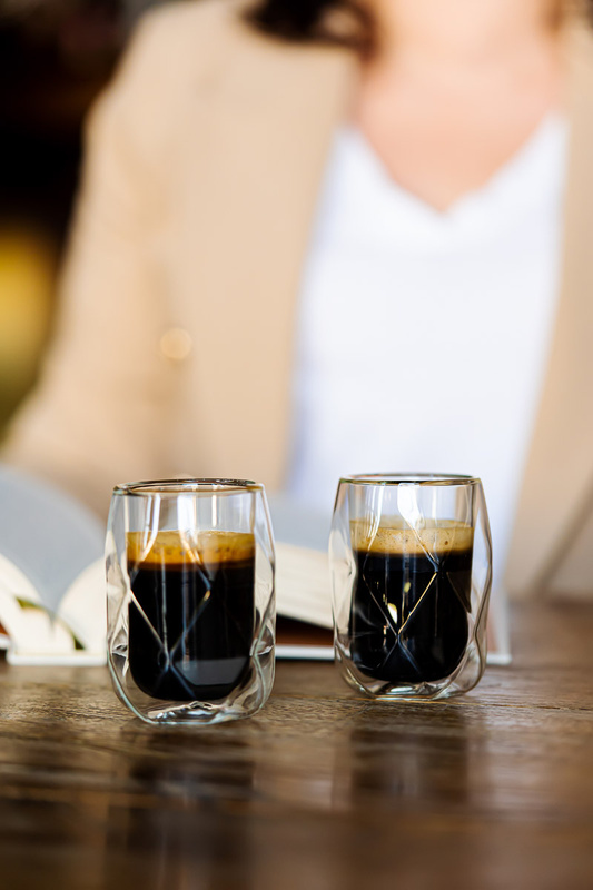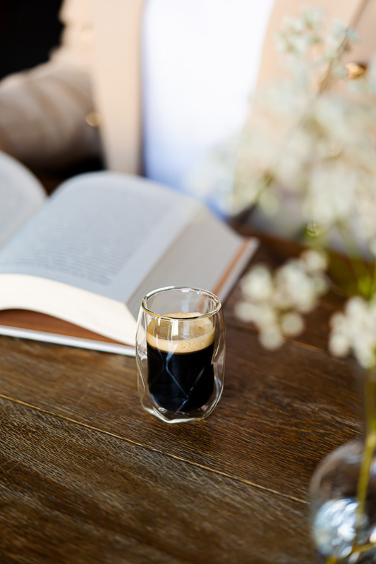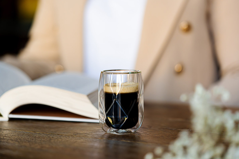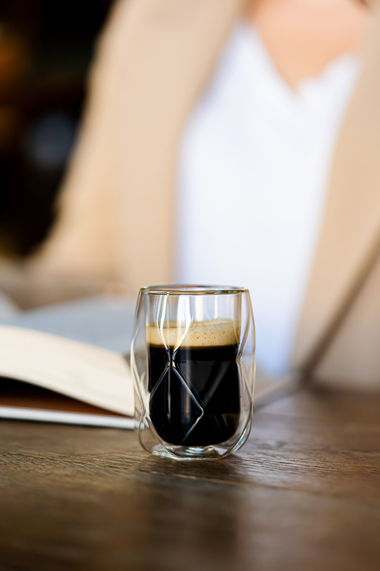 Szklanki Geo, ze względu na kształt pewnie trzyma się w dłoniach. Podwójne ścianki oraz stosunkowo mała średnica pomagają utrzymać odpowiednią temperaturę kawy. Dzięki takiemu rozwiązaniu aromat świeżo zaparzonego espresso nie jest rozpraszany. Zewnętrzna ścianka pozostaje chłodna, nawet jeśli naczynie jest wypełnione gorącą kawą.