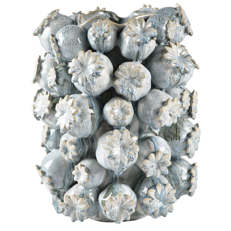 Ta przepiękna, rzeźbiarska waza z kamionki jest imponującym elementem dekoracyjnym, zarówno pusta, jak i wypełniona dużym bukietem kwiatów. Waza pokryta jest ręcznie wykonanymi i aplikowanymi ozdobami, co nadaje jej unikalny charakter.