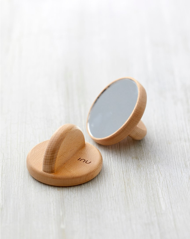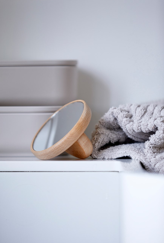 Lusterko serii spa Inu firmy Zone Denmark emanuje nowoczesnym luksusem dzięki prostemu, organicznemu wzornictwu i dekoracyjnemu jasnemu drewnu bukowemu. Lustro ma stylowy, półokrągły uchwyt i praktyczny rozmiar ułatwiający trzymanie, a szkło lustrzane jest zamontowane w ramie, aby uzyskać elegancki, naturalny wygląd.