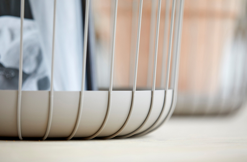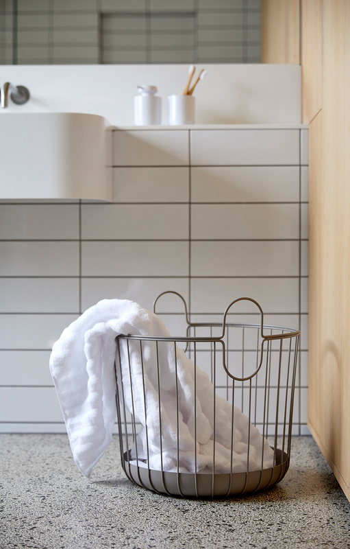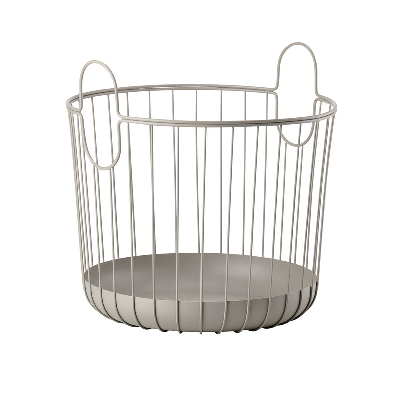 Elegancki metalowy kosz na ręczniki lub pranie w łazience, poduszki, koce i czasopisma w salonie – lub na duże, zielone rośliny w całym domu. Kosze są dostępne w dwóch rozmiarach i można je układać jeden na drugim.