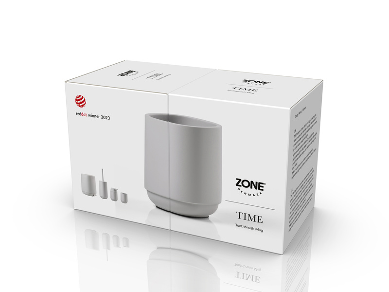 Kolekcja łazienkowa Time przyciąga wzrok swoją wyjątkowością. Zone Denmark wprowadziła innowacyjny materiał do tej linii produktów. Trzy z czterech elementów w tej serii – dozownik do mydła, kubek na szczoteczki do zębów oraz szczotka do toalety – wykonane są z betonu z dodatkiem plastikowych detali. Beton, ze względu na swoją charyzmę i naturalny urok, zdobywa coraz większą popularność w nowoczesnym projektowaniu wnętrz. Jest jednocześnie surowy i elegancki, twardy, a zarazem przyjemny w dotyku.
