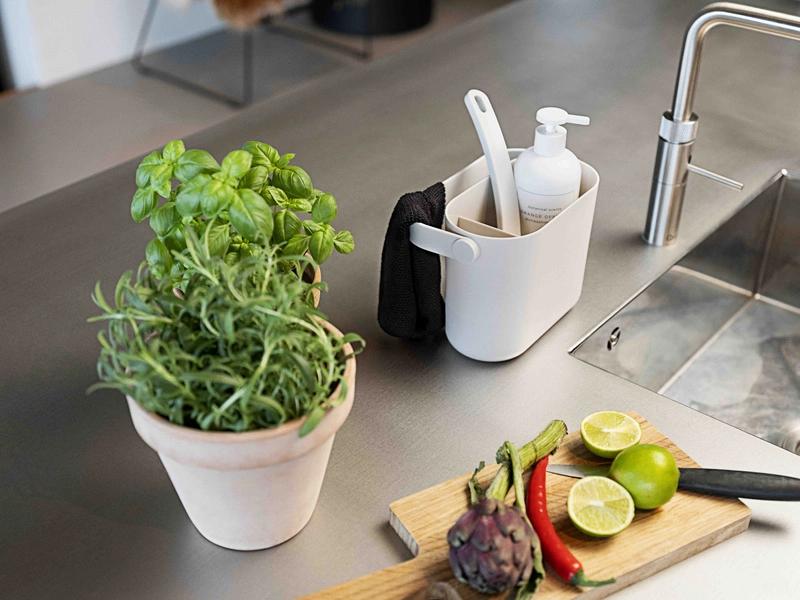 Organizer może być ustawiony w trzech pozycjach: pionowo, aby ułatwić przenoszenie, nachylony do przodu, aby wygodnie powiesić i wysuszyć ściereczkę, oraz nachylony do tyłu, co pozwala zaoszczędzić miejsce na blacie. Tacka jest również doskonała do przechowywania ulubionego dozownika na mydło – szczególnie polecany jest dozownik Ume od Zone Denmark.
