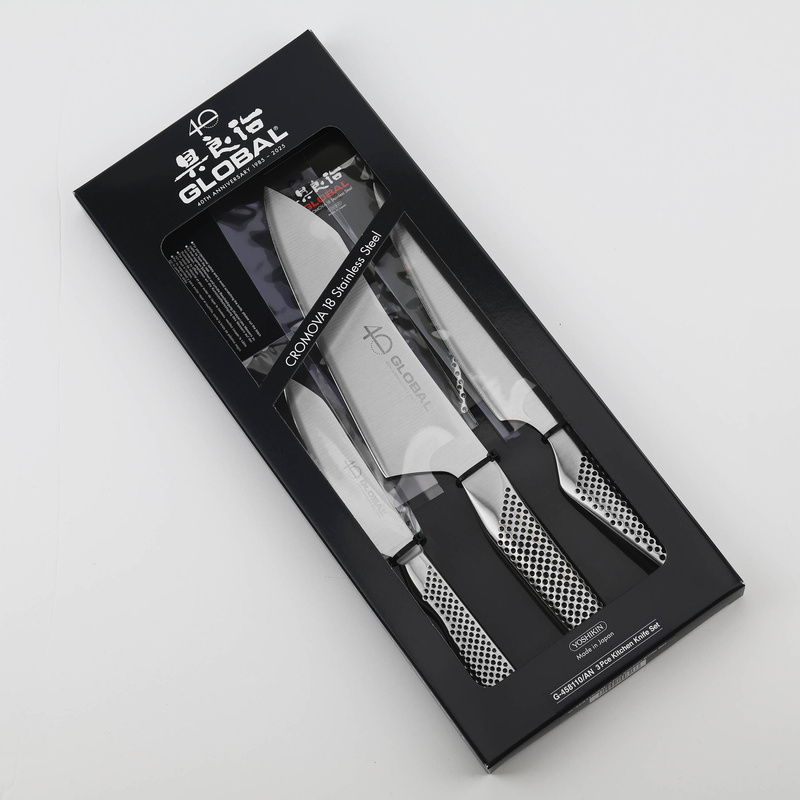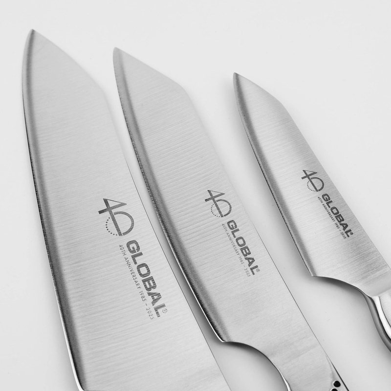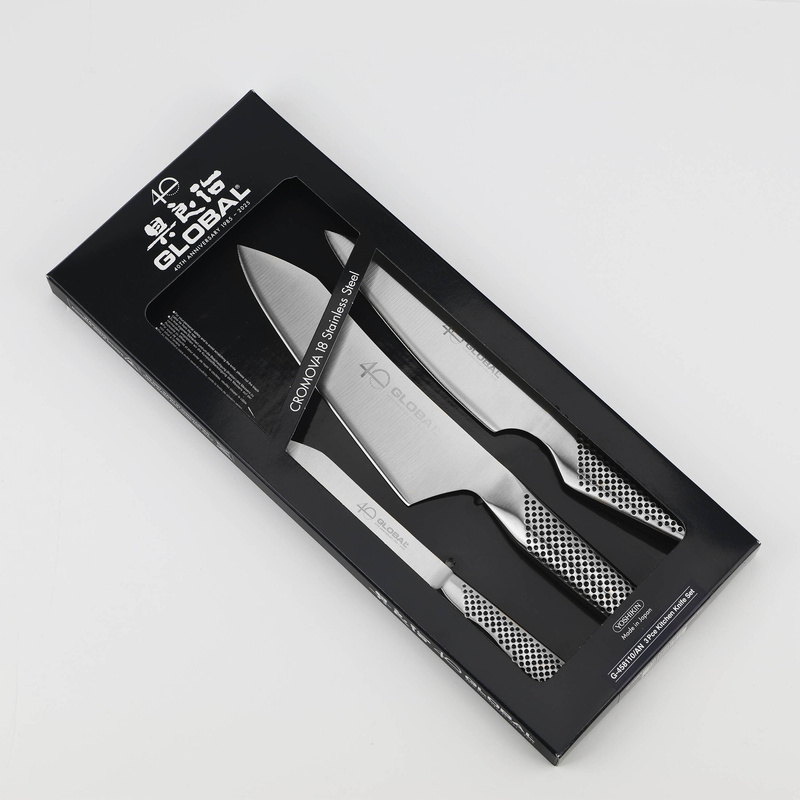 Global z okazji 40-lecia marki wypuścił wyjątkowy zestaw 3 noży w edycji Limited 40th Anniversary, w skład którego wchodzą modele G-4, GS-110 oraz GS-58. Model G-4 to klasyczny nóż szefa kuchni o wszechstronnym zastosowaniu, idealny do krojenia i siekania. GS-110 to uniwersalny nóż o długości ostrza 15 cm, świetny zarówno do krojenia mięsa, warzyw, jak i precyzyjnych prac kuchennych. Natomiast GS-58 to poręczny nóż do obierania o długości 11 cm, doskonały do precyzyjnej obróbki owoców i warzyw. Limitowana edycja to doskonały wybór dla kolekcjonerów i miłośników sztuki kulinarnej, ceniących unikalny styl i funkcjonalność.