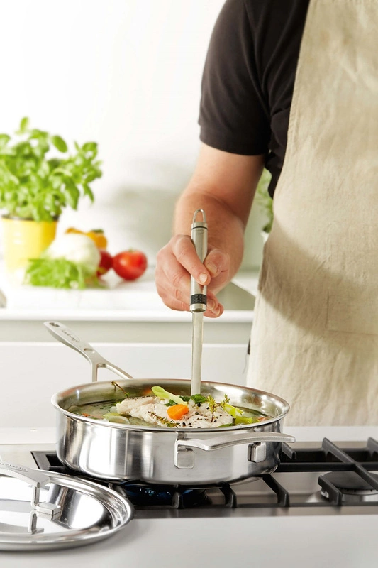Patelnia wykonana została z pięciowarstwowej mieszanki szlachetnej stali nierdzewnej i aluminium, które charakteryzuje się doskonałą przewodnością. To właśnie dzięki temu ciepło rozprowadzane jest szybko i równomiernie na całej powierzchni nawet przy punktowym dostępie energii. Specjalna powłoka Silvinox® to kolejna zaleta, która ułatwia codzienną pracę umożliwiając łatwe i szybkie czyszczenie i zapobiegając przebarwieniom przez długie lata. Ponadto wykończenie nadaje patelni srebrzysto-białą barwę, która pięknie prezentuje się w każdej kuchni. Patelnia wyposażona jest w dwa poręczne uchwyty wykonane ze stali o niskiej przewodności. Dzięki temu nawet bezpośrednio po zdjęciu z palnika pozostają one przyjemnie chłodne, zapewniając bezpieczeństwo. Szczelna pokrywa umożliwia przygotowanie dań nawet przy niewielkiej ilości wody czy tłuszczu, dbając jednocześnie o nieuciekanie ciepła i czyniąc gotowanie jeszcze bardziej ekonomicznym. Głęboka patelnia Demeyere Industry używana być może na wszystkich rodzajach kuchenek, w tym indukcyjnych. Z tym praktycznym pomocnikiem wszystkie serwowane dania wprawią gości w zachwyt.