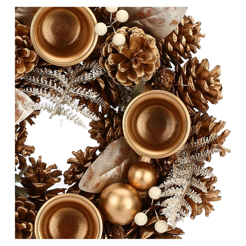 Bogato zdobiony świecznik z kolekcji Versoloro to prawdziwa ozdoba świątecznego stołu. W formie wieńca, wykonany z licznych elementów dekoracyjnych utrzymanych w ciepłej, złoto-brązowej tonacji, tworzy efektowną i przytulną kompozycję. Całość została uzupełniona czterema metalicznymi, złotymi gniazdami na tealighty, rozmieszczonymi symetrycznie wśród dekoracyjnych dodatków.