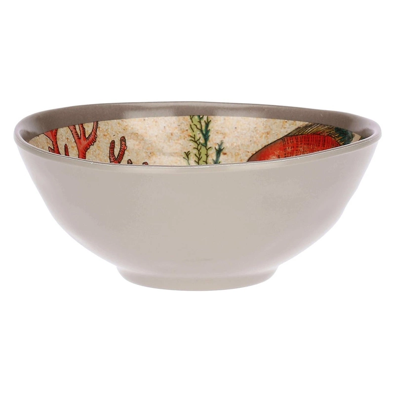 Okrągła miska z kolekcji Sea Life to połączenie trwałości i spokojnego, morskiego stylu. Wykonana z melaminy, jest lekka, wytrzymała i odporna na stłuczenia – idealna do codziennego użytku, także na zewnątrz. Jej wnętrze zdobi starannie wykonany wzór z rybami i koralowcami w beżowej tonacji, która kojarzy się z piaskiem i nadbrzeżnym krajobrazem. Z zewnątrz miska utrzymana jest w jednolitym, jasnym kolorze, co nadaje jej elegancki i naturalny wygląd.