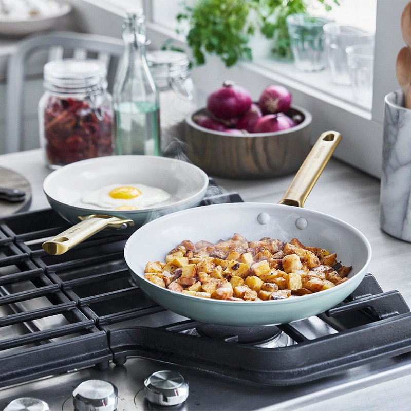 Zestaw patelni ceramicznych z kolekcji Padova - luksusowe wzornictwo i materiały, z których została wykonane. Ulubione patelnie influencerów i stylistów jedzenia. Wyjątkowe połączenie kolorystyczne: niebieskiego koloru patelni i garnków ze złotymi, stalowym uchwytem. Patelnie pokryte są ekologiczną powłoką ceramiczną Thermolon Infinity Pro wzmocnioną diamentami, wolną od PFAS. Powłoka jest gładka, co powoduje, że potrawy nie przywierają podczas smażenia. Grube dno wykonane w technologii Magneto, które można stosować na wszystkich rodzajach kuchenek, także indukcyjnych. Patelnie się szybko nagrzewają i rozprowadzają ciepło, kumulują je, dlatego też należy z nich korzystać na średnich mocach kuchenek, co pozwala oszczędzać energię elektryczną. Można z nich korzystać w piekarniku do 220oC. Uchwyty patelni w technologii PVD. Właściwości antyalergiczne uchwytów. Można myć w zmywarce, rekomendacja mycia ręcznego w celu wydłużenia żywotności powłoki patelni.