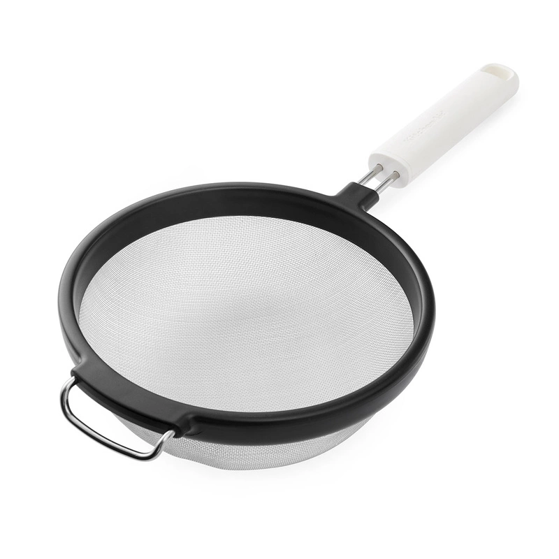 KitchenAid Culinary Tools - sitko kuchenne z uchwytem 17cm Porcelain White KitchenAid Culinary Tools - sitko kuchenne z uchwytem 17cm Porcelain WhiteStalowe sito/durszlak KitchenAid do przesiewania i odcedzania sito z drobnymi oczkami pozwala m.in przesiać, wypłukać, odcedzić gotowane warzywa i makaronwygodny, długi i ergonomiczny uchwyt , boczny haczyk do oparcia sitka o krawędź misy, garnkamożna myć w zmywarce ,