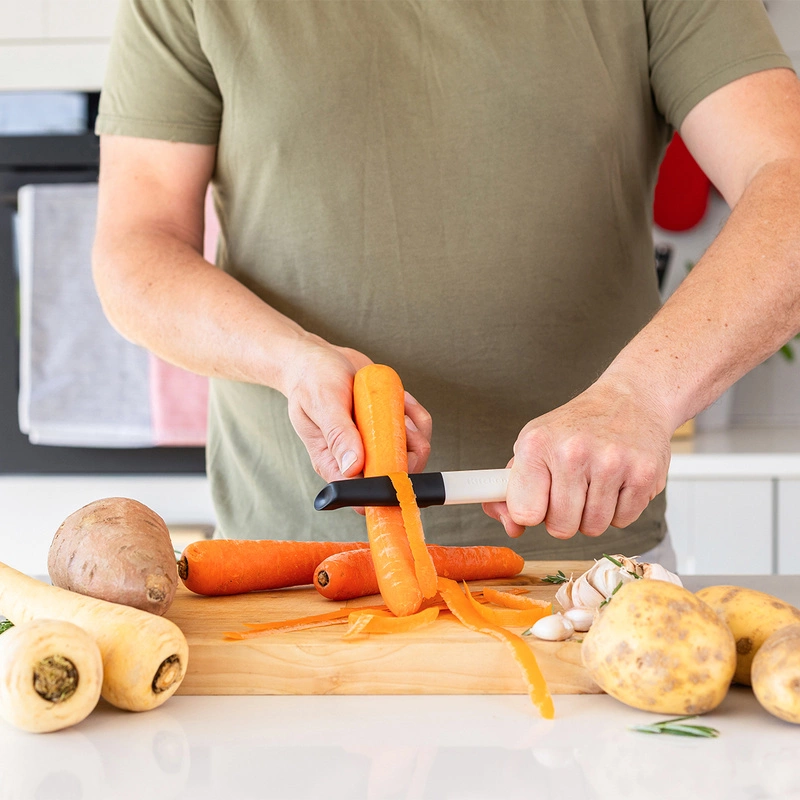 • wytrzymałe ostrze z łatwością obiera owoce i warzywa, nawet te z miękką skórką np. pomidory,