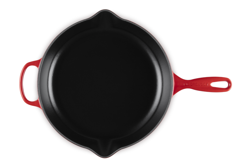Żeliwna patelnia Signature Le Creuset 30 cm emaliowana kolor Czarny do smażenia i serwowania. Wyposażona w uchwyt żeliwny zapewniający bezpieczne przenoszenie, jednocześnie można naczynie używać do zapiekania w piekarniku. Dwie wylewki zapewniają wygodne wylewanie płynów i sosów.