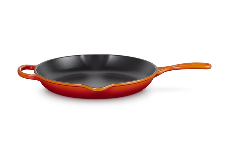 Żeliwna patelnia Signature Le Creuset 30 cm emaliowana kolor płomienny do smażenia i serwowania. Wyposażona w uchwyt żeliwny zapewniający bezpieczne przenoszenie, jednocześnie można naczynie używać do zapiekania w piekarniku.  Dwie wylewki zapewniają wygodne wylewanie płynów i sosów.