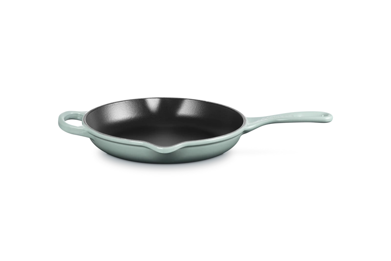 Żeliwna patelnia Signature Le Creuset 30 cm emaliowana kolor sea salt do smażenia i serwowania. Wyposażona w uchwyt żeliwny zapewniający bezpieczne przenoszenie, jednocześnie można naczynie używać do zapiekania w piekarniku. Dwie wylewki zapewniają wygodne wylewanie płynów i sosów.