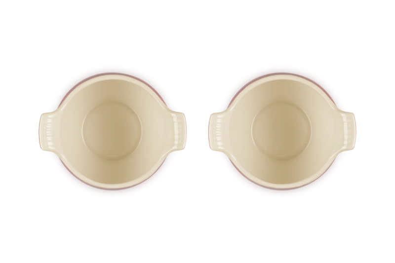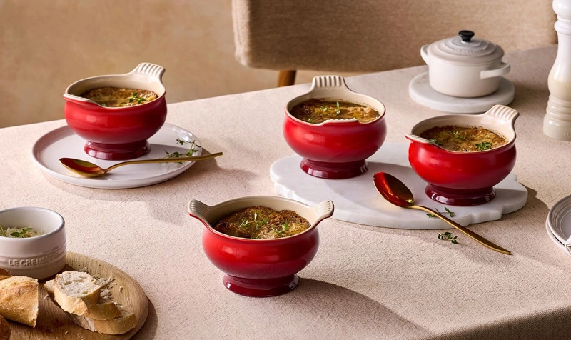 Są wykonane z wytrzymałej kamionki, więc możesz umieścić je w piekarniku, aby przygotować tradycyjną francuską zupę cebulową.
