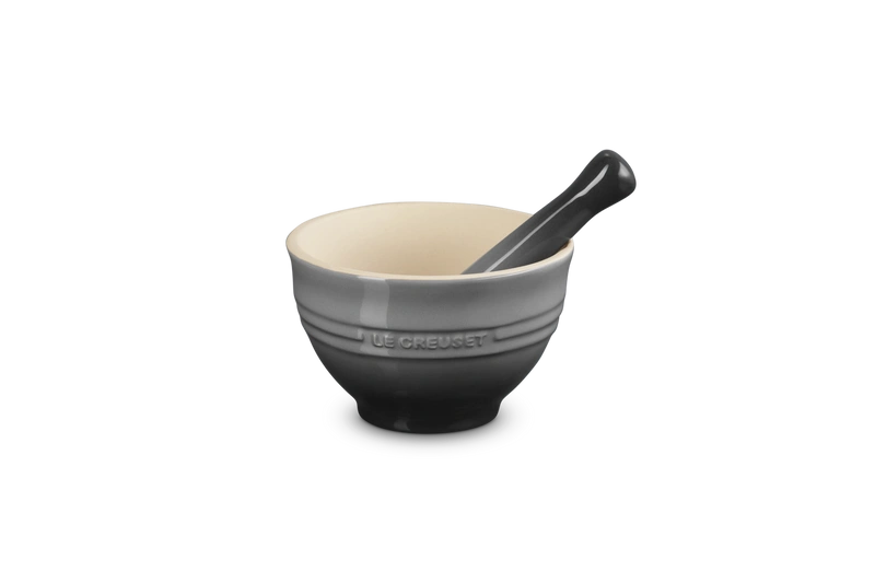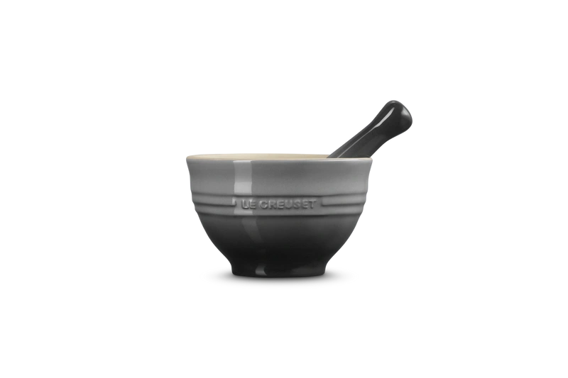 Ceramiczna moździerz kuchenna w kolorze szarym flint francuskiej marki Le Creuset.
