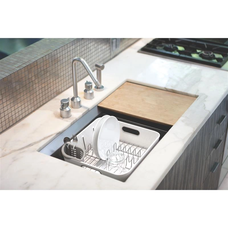 Ociekacz może stać bezpośrednio w zlewozmywaku jak i na blacie. Posiada obrotowy odpływ, który umożliwia ściekanie wody bezpośrednio do zlewu. Wyjmowany stalowy wkład i pojemnik na sztućce ułatwia czyszczenie plastikowej obudowy.