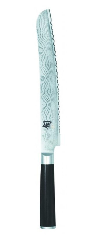 Nóż do pieczywa z serii Shun, wykonany z wyjątkowo twardej, nierdzewnej, wysokowęglowej stali damasceńskiej. Rękojeść o ergonomicznym kształcie została wykonana z powlekanego drewna Pakka. Ostrze noża składa się z kilkunastu wartst stali widocznych gołym okiem.
