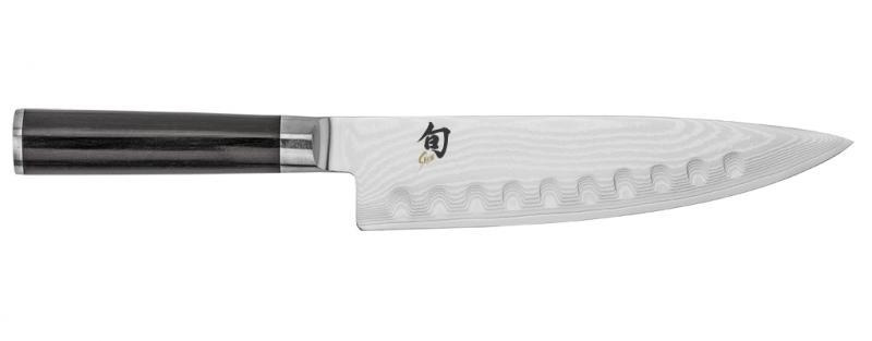 Nóż kucharski karbowany z serii Shun, wykonany z wyjątkowo twardej, nierdzewnej, wysokowęglowej stali damasceńskiej. Specjalne wyżłobienia w ostrzu noża umożliwiają krojenie bardzo cieńkich plastrów. Rękojeść o ergonomicznym kształcie została wykonana z powlekanego drewna Pakka. Ostrze noża składa się z kilkunastu wartst stali widocznych gołym okiem.