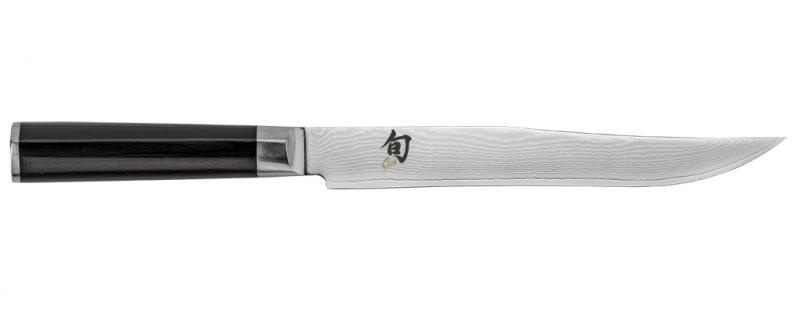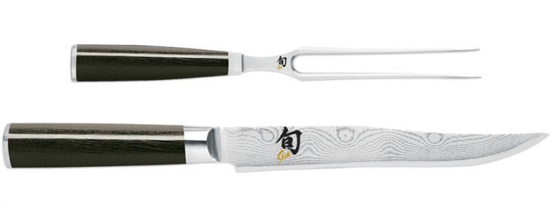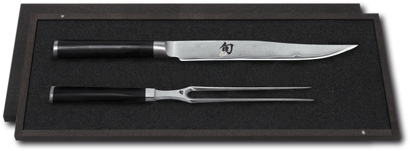 Zestaw widelec oraz nóż do mięs z serii Shun, wykonany z wyjątkowo twardej, nierdzewnej, wysokowęglowej stali damasceńskiej. Rękojeść o ergonomicznym kształcie została wykonana z powlekanego drewna Pakka. Ostrze noża składa się z kilkunastu wartst stali widocznych gołym okiem.