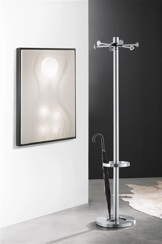 Nowoczesny wieszak wykonany z wytrzymałej matowej stali nierdzewnej. Posiada wykończenia z czarnego tworzywa sztucznego. Masywna podstawa gwarantuje stabilność.